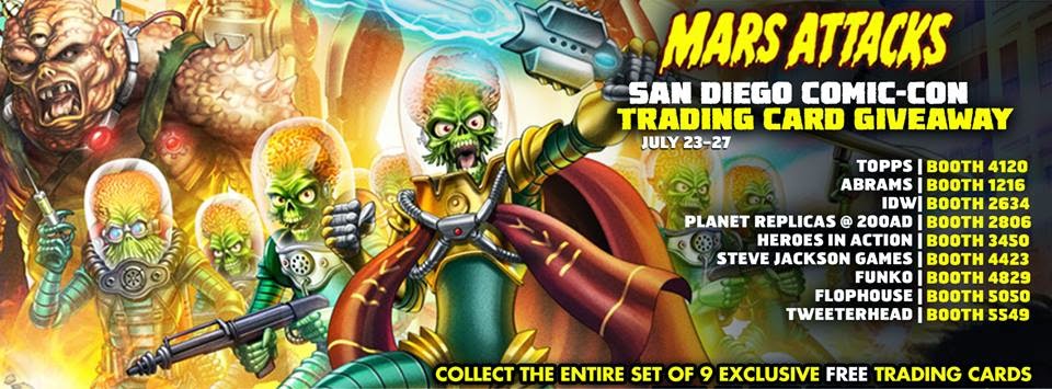 With all the excitement over Garbage Pail Kids, Topps will be hosting another Mars Attacks Trading Card Scavenger Hunt. Consisting of 9 exclusive free connecting puzzle cards, the set features all-new art by Chad McCown and is the first official continuation of the 2013 card series, Mars Attacks: Invasion! The first card will be given away FREE at the Topps Booth (4120), with subsequent cards handed out free at a variety of other booths around the show. The back of each card will point convention-goers to the location of the next card in the series (fans can also find the full list of booths by visiting www.facebook.com/MarsAttacks).